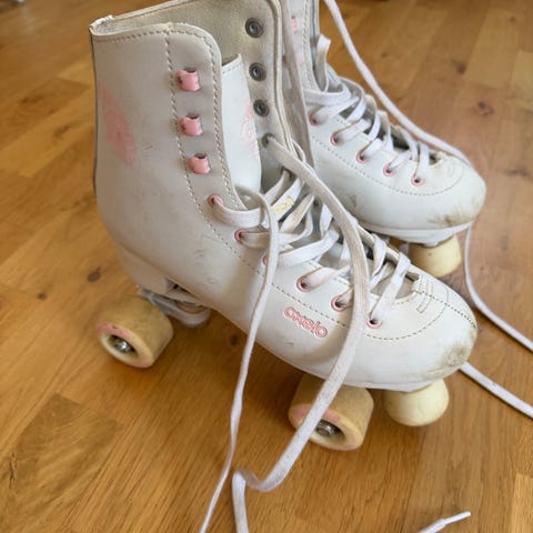 Oxelo rullskridskor för barn i storlek 35. Klassisk modell med fyra hjul, snörning framtill och bromskloss fram på varje sko. Pris 150:-