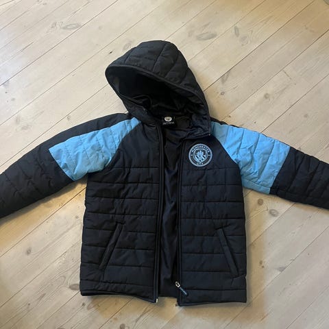 Fodrad blå Adidas jacka för barn i storlek 164, unisexmodell. Jackan har de klassiska vita Adidas ränderna på ärmarna. Den har huva och dragkedja framtill. På bröstet finns Adidas-logga och initialerna "EB" tryckta. Kanterna på EB:et har gått upp något på kanterna. Se bild 4. Skön ytterjacka för vardag och fritid.