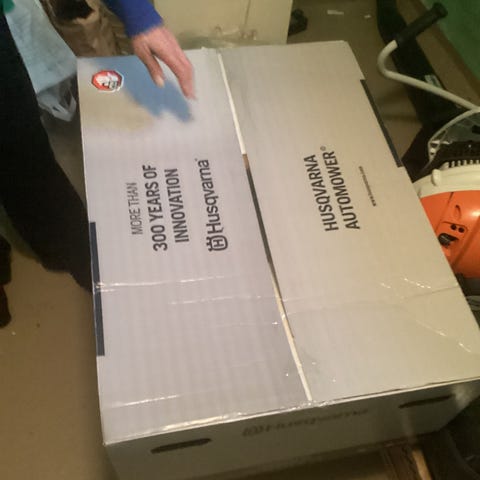 Lufter ET800-1 robotgräsklippare. Produkten levereras i originalkartong med robotgräsklippare, laddstation, strömadapter, begränsningskabel, fästen och användarmanual enligt bilder. Robotgräsklipparen är avsedd för automatisk klippning av gräsmatta inom ett område som avgränsas med medföljande kabel. Manualen innehåller information om installation, inställningar, säkerhet och skötsel.