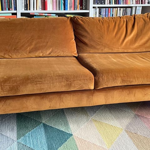 Mörk sammetssoffa som är väldigt bekväm och i bra skick.