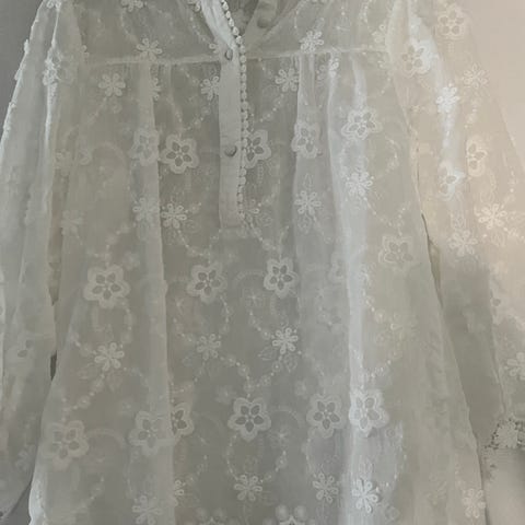 Vit tunika med svarta broderade detaljer på ärmar och nederkant. Tunikan har en V-ringning med knytband och svarta passpoaler längs halsringningen och i midjan. Ärmarna är trekvartslånga och puffiga vid axlarna.