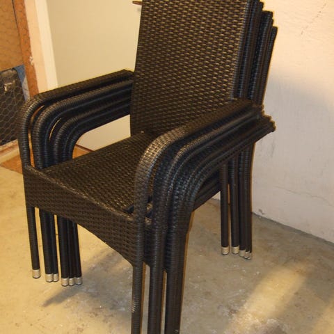 Utemöbelset bestående av en soffa, två stolar och två bord i svart färg. Soffan har metallstomme med ribbad rygg och sits samt armstöd i träliknande material och lös sittdyna i grått tyg. De två stolarna har låg sitthöjd med flätad plast- eller konstrottingliknande sits och rygg på metallstomme. De två borden har kvadratiska bordsskivor och öppna underreden i metall med enkel, rak design. Passar för uteplats, balkong eller altan.