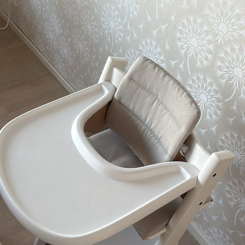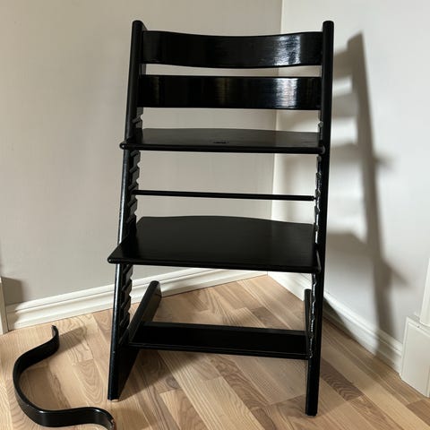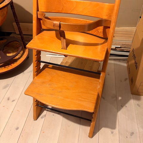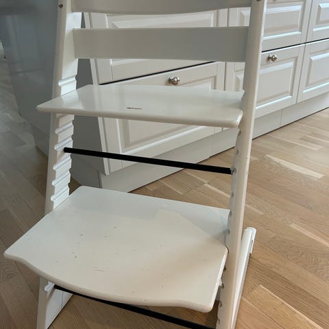 Stokke Tripp Trapp matstol i trä. Klassisk hög barnstol med justerbar sittyta och fotstöd som kan anpassas efter barnets ålder och längd. Stolen är utformad för att kunna dras intill matbordet så att barnet sitter med vid bordet. Passar som matstol för barn och kan användas under lång tid tack vare den flexibla konstruktionen.
