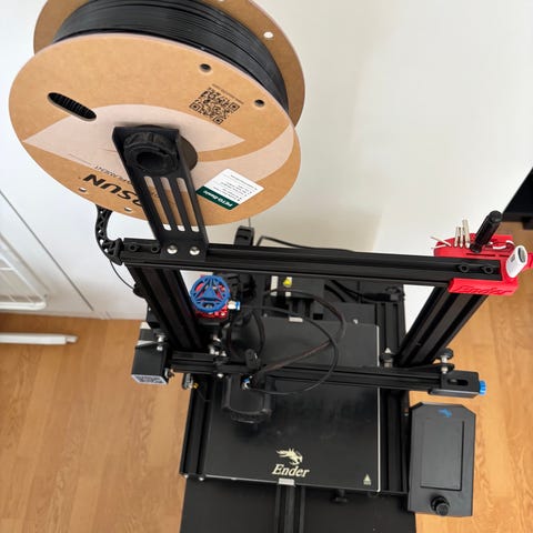 Sovol 3D-skrivare FDM i svart och blå färg. Fristående bordsskrivare med öppen ramkonstruktion och uppvärmd byggplatta. Utrustad med separat styrpanel/display och kablage för anslutning till elnät. Lämplig för utskrift av modeller och prototyper i vanliga filament.