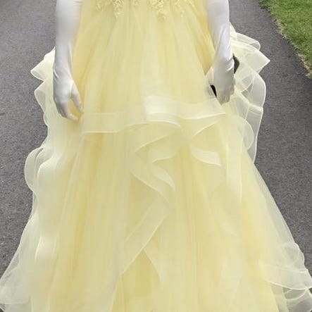 Drömmig gul balklänning med spetsdetaljer och snörning i ryggen. Kjolen är riktigt voluminös i flera lager tyll och har vackra broderade blommor med glitter. Andvänd 1 gång, från märket LQ design köpt på bröllopshuset i Linköping för 8000. Storleken är 40/M men är snörning i ryggen så går att få den lite större och även mindre. Finns att prova i Åtvidaberg. Underkjol, handskar och klädpåse ingår vid köp av klänningen!🤩💛 Skriv gärna för fler bilder eller frågor!💛