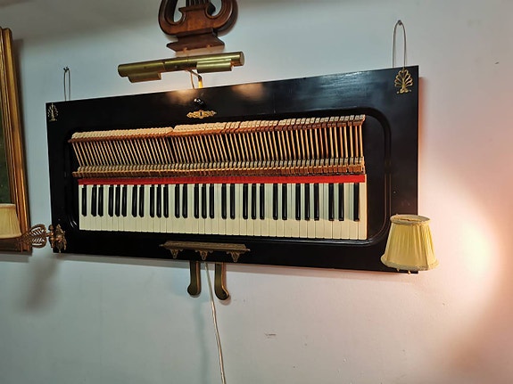 Vackert antikt Frankel & Co stående piano i vit färg. Klassisk modell med dekorativa mässingsdetaljer på fronten.