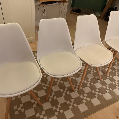 Säljer fyra stycken Eames chairs i olika färger (vit, grå, svart, röd). Alla i mycket gott skick, utom den svarta som har en mindre repa.