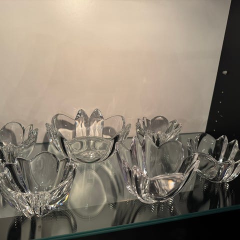 Glasskålarna är i klar kristall med ett dekorativt, kronliknande mönster runt om. Höjden är cirka 8 cm och diametern cirka 13 cm enligt måttband på bilderna.