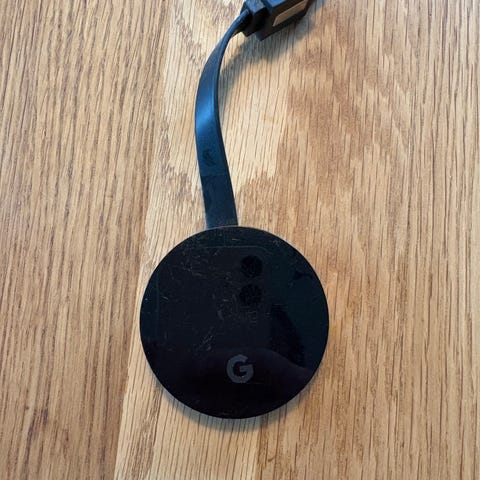 Google Chromecast mediaspelare i svart färg. Enheten ansluts via HDMI till TV eller skärm och strömförsörjs via USB-kabel som ingår på bilderna. Mediaspelaren används för att strömma bild och ljud trådlöst från kompatibla enheter som mobil, surfplatta eller dator till TV:n. Lämplig för hemmabruk där man vill spela upp innehåll från olika appar och tjänster på en större skärm.