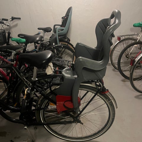 Fint bruksskick, precis bytt en fotrem som gått sönder. Dubbla cykelfästen för att kunna skifta vilken cykel som skjutsar.