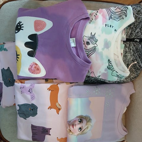Klädpaket: Didriksons randig fleecejacka i storlek 110. Fint skick. Didriksons rosa fleecejacka i storlek 110. Fint skick. Didriksons rosa fleecebyxor i storlek 100. Fint skick. HM blommig klänning i storlek 110. Fint skick.