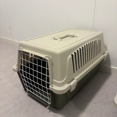 Transportbur för katt eller liten hund i hårdplast. Överdel i ljus plast och underdel i mörk plast, med metallgallerdörr framtill. Buren har ventilationsöppningar runtom och bärhandtag på ovansidan. Lämplig för transport av mindre husdjur i bil eller vid kortare resor.