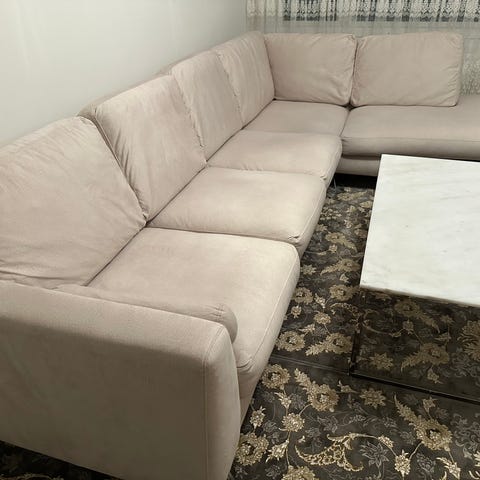Stor och mycket bekväm svart hörnsoffa med divan från Mio. Soffan är i halvläder (äkta läder på framsidan och konstläder på baksidan av ryggkuddar och sittdynor). Konstlädret på baksidan har börjat släppa och är delvis bortplockat (se bild 4–6 för skador). Framsidan där man sitter är i bra skick.