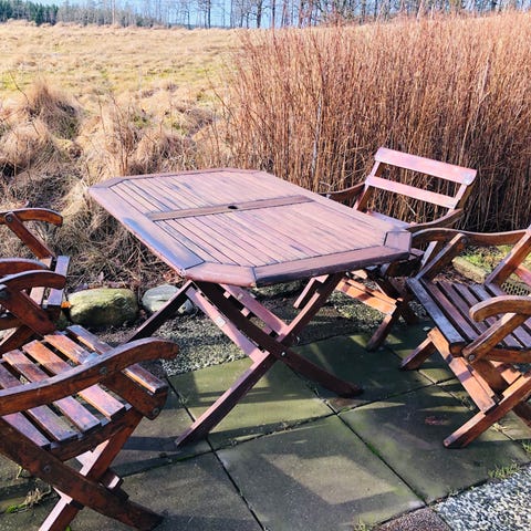 Trädgårdsbord i trä med ribbad bordsskiva i brunlaserat trä. Bordsskivan har ett hål i mitten för parasoll. Till bordet hör en positionsstol i matchande trä med ribbad sits och rygg samt armstöd. Passar för uteplats, altan eller trädgård.