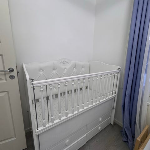 Säljer en Troll Royal spjälsäng med tillhörande juniorsida och madrass.