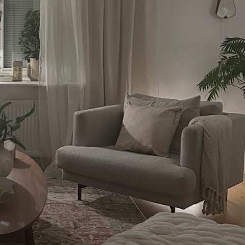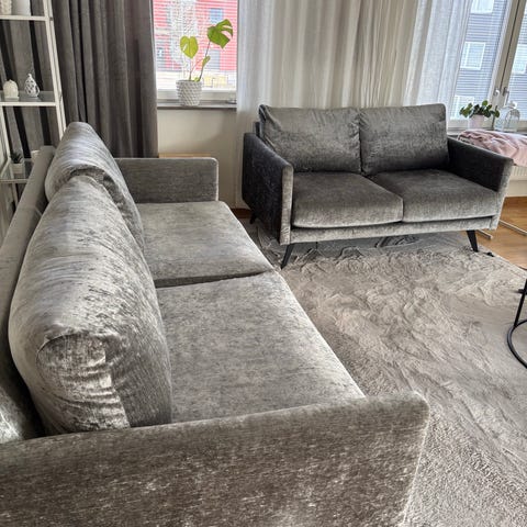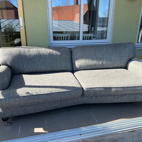 Modern soffa i tidlös stil med mjukt rundade former inklusive fotpall på hjul.