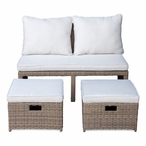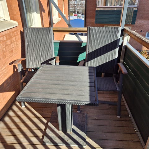 Utemöbelset bestående av en bänk/soffa, två fåtöljer och ett rektangulärt bord. Möblerna är i svart färg med metallstomme och sits/rygg i matchande material. Bordet har ribbad bordsskiva. Passar för användning på balkong, altan eller uteplats som sittgrupp för flera personer.