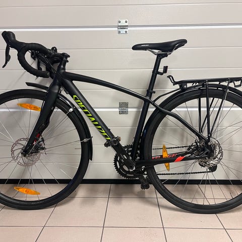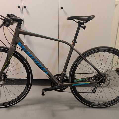 Custombyggd kolfiberhybrid, för snabb pendling och träning, ihopsatt från ram med handplockade delar i nyskick eller mycket bra begagnat. 20-växlad SRAM-drivlina (X5/X7) med Shimano-vevparti (50/34) och 12-28T kassett, hydrauliska skivbromsar (Shimano MT200) och 35 mm snabbrullande Schwalbe G-One Allround däck för god komfort och stabilitet även utanför asfalten. Sadel från namnkunniga Bontrager, modellen heter Verse Comp (155 mm). Sprillans nya handtag från Nukeproof.