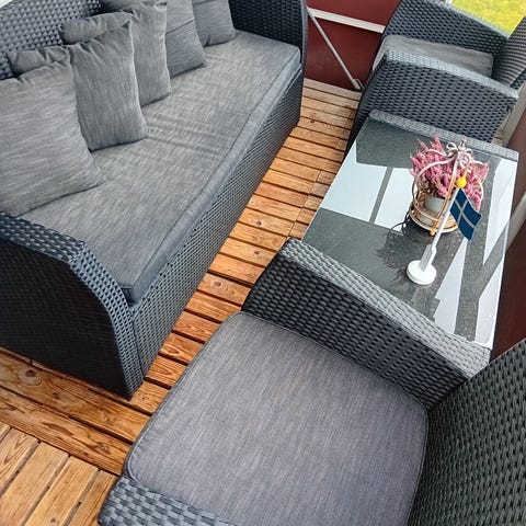 Balkongmöbelset bestående av två fåtöljer, en soffa och ett rektangulärt bord. Möbelgruppen är avsedd för utomhusbruk på balkong eller uteplats. Sittdynor ingår enligt bild. Setet står på en grön matta som också kan ingå enligt uppgift i bilden. Passar för sittgrupp med plats för flera personer på mindre ytor som balkong eller terrass.