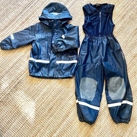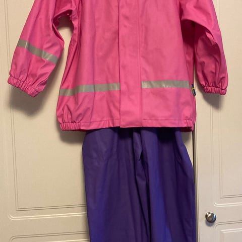 Regnställ med jacka och byxor. Jackan är blå med huva och knäppning framtill. Byxorna är mörkblå med hängslen och resår vid bensluten. Både jackan och byxorna har reflexdetaljer. Storlek 70