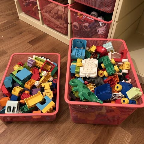 Lego Duplo, olika typer av Duplo-bitar i flera färger och former, bland annat fordon, hjul, figurer och byggdelar. Den gula förvaringsväska med fack ingår. Lämpligt för lek och byggande för yngre barn som använder Duplo-systemet.