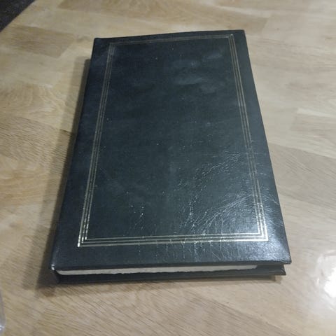 Jag säljer nu ett svart fotoalbum med hård pärm. Ryggen har dekorativa ränder. Passar för förvaring och organisering av fotografier eller samlarbilder.