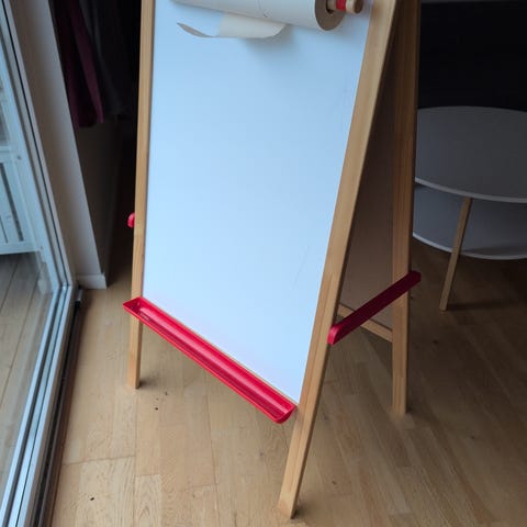IKEA staffli för barn med dubbelsidig rit- och skrivyta. Ena sidan är whiteboard och den andra sidan är griffeltavla. Staffliet har träram och en röd hylla undertill för förvaring av kritor, pennor eller sudd. Höjden är cirka 112 cm, bredden cirka 48 cm och djupet cirka 66 cm enligt produktbilden med mått. Passar för barn som vill rita, skriva eller leka skola hemma.