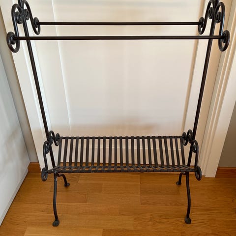 Hylla med flera plan i vitmålat trä. Öppen, ribbad design på hyllplanen som ger god ventilation och gör den lämplig för förvaring av till exempel skor, korgar, handdukar eller andra hushållsartiklar. Passar i hall, badrum, förråd eller andra utrymmen där extra förvaring behövs.