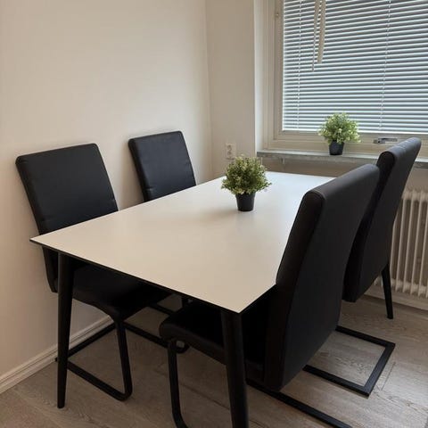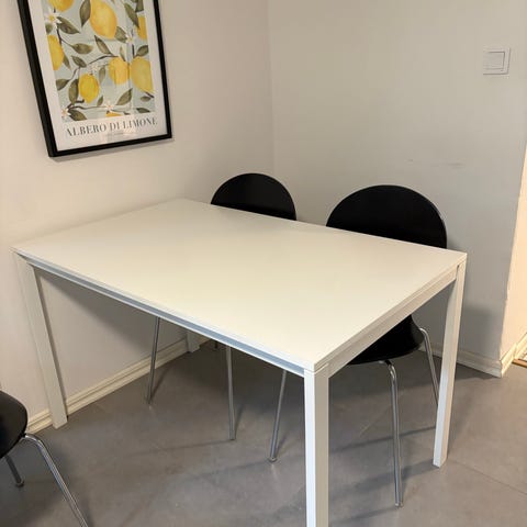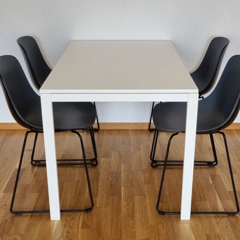 Säljer en smidig matgrupp från IKEA: 1 vitt MELLTORP bord (75×75 cm) + 2 svarta TEODORES stolar. Stilrent och perfekt för liten matplats, kök eller som skrivbord.