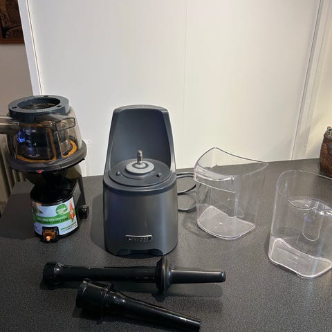 Paket med flera köksmaskiner och tillbehör. En elektrisk potatisskalare enligt kartongtext, lämplig för skalning av potatis. En elektrisk juicepress med uppsamlingsbehållare, avsedd för att pressa frukt och grönsaker. Ett set med passervagga/matmill från Ernesto i rostfritt stål med utbytbara skivor för olika grovlekar vid passering av exempelvis grönsaker och frukt. På bilderna syns även en rund elektrisk platta med dekorativ text och löstagbara triangelformade plattor, avsedd för matlagning eller bakning. Alla delar är avsedda för användning i kök vid matberedning och tillagning.