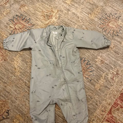 En grön overall från Newbie, storlek 68 (barnen har använt den mellan storlek 62 och 74).