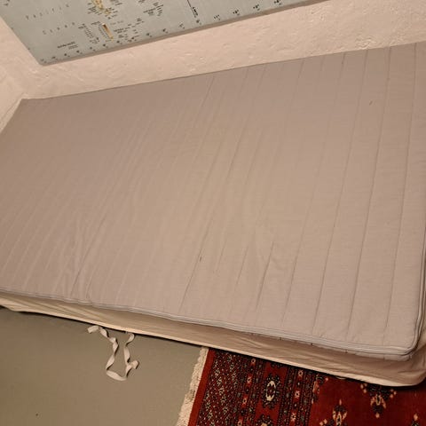 Ganska sliten men väldigt skön säng säljes. Bäddmadrassen är av typen memoryfoam.