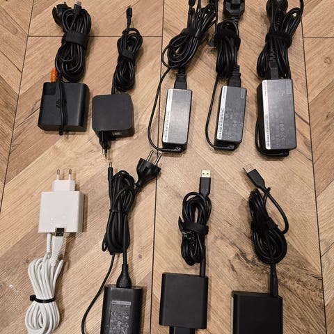Lenovo och HP nätadaptrar för bärbar dator. Flera olika modeller av laptop-laddare i svart färg med nätkabel och DC-kontakt. Avsedda som strömadaptrar till kompatibla Lenovo- och HP-datorer. Kontrollera modellnummer och specifikationer på adaptrarna mot din dator för att säkerställa kompatibilitet innan användning.