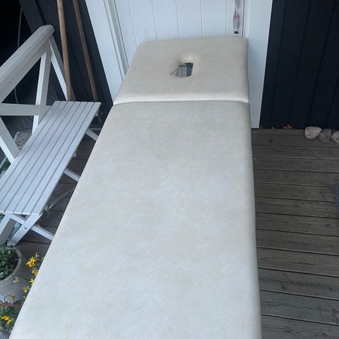 Tarsus massagebänk i hopfällbar modell. Bänken har vadderad liggyta med blå klädsel och ansiktshål i ena änden. Stabil vit metallstomme med krysstag för ökad stadga. När bänken är hopfälld blir den platt och lättare att förvara eller transportera. Lämplig för massage, behandlingar eller avslappning i hemmet eller på mottagning.