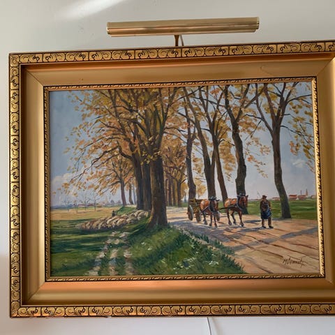 Tavla med motiv av vinterlandskap med väg, trädallé och gårdsbebyggelse i bakgrunden. Målningen är signerad i nedre hörnet. Verket är inramat i en profilerad guldfärgad ram. På bilderna syns måttstock som indikerar ungefärliga yttermått på ramen. Passar som väggdekoration i exempelvis vardagsrum, hall eller kontor.