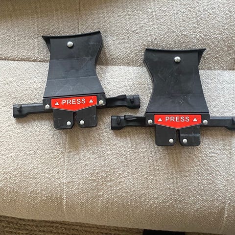 Adapter som passar Emmaljunga Viking barnvagn och babyskydd från Maxi-Cosi. Fungerar även med flera andra märken som BeSafe, Kinderkraft m.fl. I bra skick.