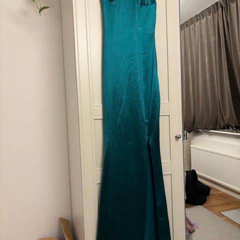 Längre klänningen i en vacker grön färg. Skulle säga att den är mer grön grön i färgen än vad som syns på bild. Klänningen har smala axelband och en knytning i midjan som framhäver figuren. Den är designad med en elegant halsringning. Klänningen är perfekt för festliga tillfällen eller en elegant middag. Storlek S. Ny med prislapp. Nypris 399