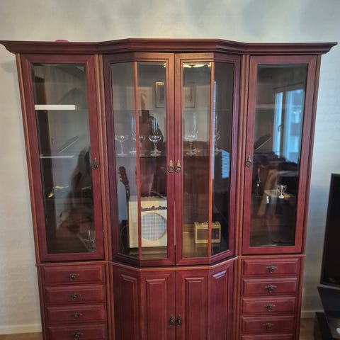 Mycket vackert vitrinskåp i klassisk rokokostil med exklusiva detaljer. Skåpet har eleganta böjda glas på sidorna, flera glashyllor samt inbyggd belysning som lyfter fram det man vill visa upp – perfekt för glas, porslin, samlarföremål eller dekorativa objekt.
