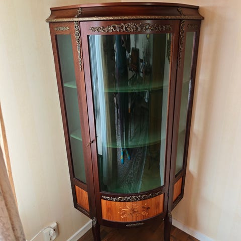 Elegant vitrinskåp i rokokostil – böjt glas, belysning och intarsia