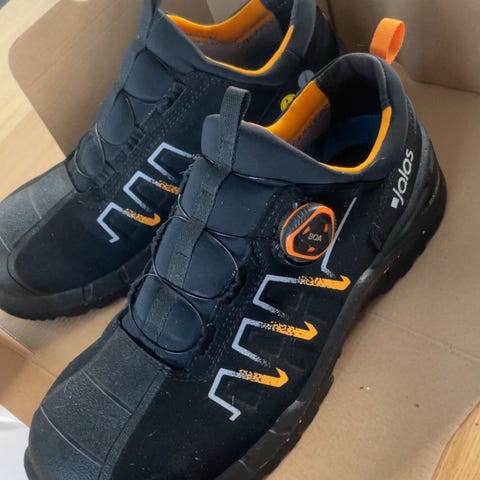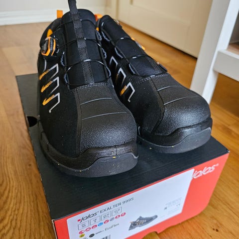 Jalas arbetsskor i svart färg i storlek 44. Skorna har kraftig sula och förstärkt ovandel anpassad för arbete och vardagligt bruk. Detaljer i gult och reflexliknande inslag på ovandelen. Lämpliga som skydds- eller arbetsskor beroende på specifik modell och klassning som kan kontrolleras på märkningen i skon.