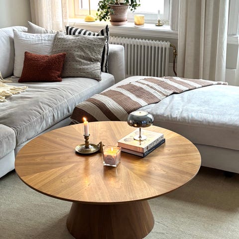 Rektangulärt soffbord med avrundade kanter, vilket ger ett mjukare intryck. Soffbordet har en hylla för öppen förvaring, samt en liten låda för dold förvaring. Bordsskivan är i fanerad ek och resterande är massiv ek.