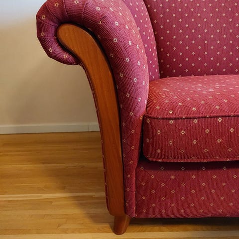 Tyget: Mönstret är det ikoniska "Gripsholm" (ofta kallat Gripsholm röd eller mönster 34). Det är ett av deras mest populära kretongtyger och föreställer fantasifulla blommor och fåglar i en stil som för tankarna till svenskt 1700-tal.