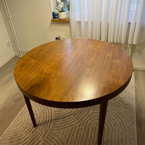 Retro runt matbord i teak & valnöt från Skaraborgs Möbelindustri i Tibro. 1950/1960-tal i fint skick skick se bilder.
