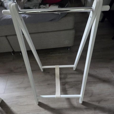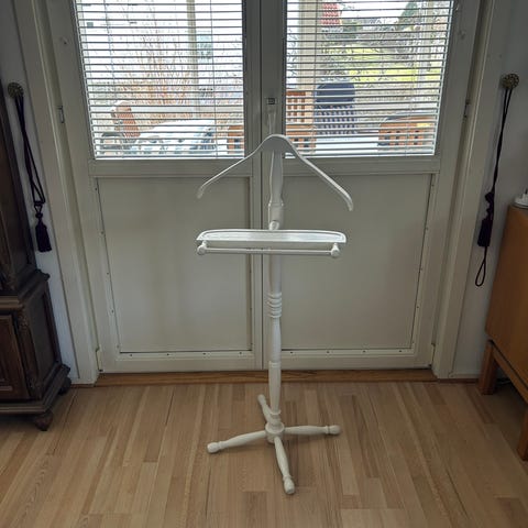 Herrbetjän (eller klädbetjänt) i rotting, målad i vitt. Denna typ av möbel var populär under 1900-talets andra hälft, särskilt med influenser från italiensk design.