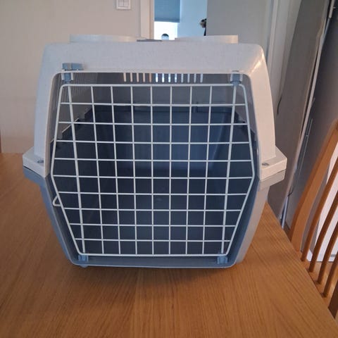 Transportbur för katt eller liten hund i plast. Överdel i ljus färg med galler upptill och underdel i blå färg. Burens konstruktion är anpassad för transport av mindre husdjur, till exempel vid bilresor eller veterinärbesök. Öppning framtill för enkel in- och utgång samt ventilation genom gallret i taket.
