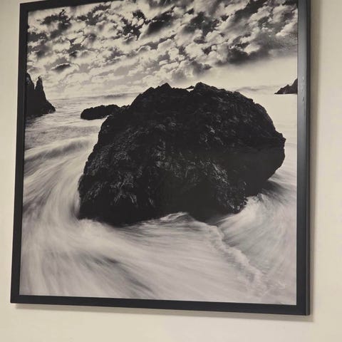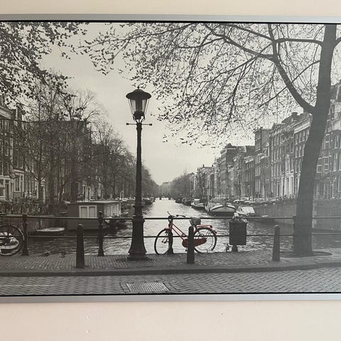 Svartvit tavla med stadsmotiv föreställande en kanal med bro, gatlyktor, cykel och byggnader längs vattnet. Motivet är inramat och passar som väggdekoration i exempelvis vardagsrum, sovrum eller hall. Stilrent fotografiskt tryck i dämpade toner som ger ett lugnt intryck på väggen.