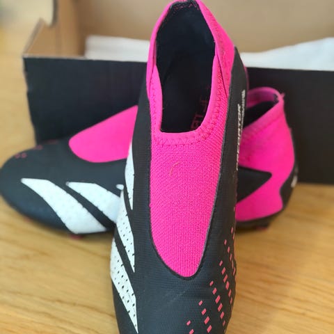 Adidas Predator fotbollsskor använda några få gånger. Skorna har en strumpliknande ovandel utan traditionella skosnören för en tight passform runt foten. Yttersulan är utformad för spel på gräs med fasta dobbar. Passar för fotbollsspelare som vill ha en sko med bra grepp och stöd vid spel på naturgräsplaner.