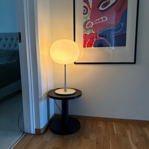 Gatto Piccolo bordslampa formgiven av Achille Castiglioni. Lampan har en vit skärm med vertikala linjer och står på en rund bas. Den är försedd med sladd och strömbrytare. Passar som belysning på exempelvis sängbord, sidobord eller skrivbord i hem- eller kontorsmiljö.