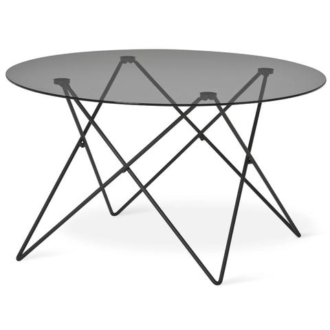 Bordsskivan i klart härdat glas står på en skulptural bas i grovt pulverlackerat stål för ett arkitektoniskt utseende.