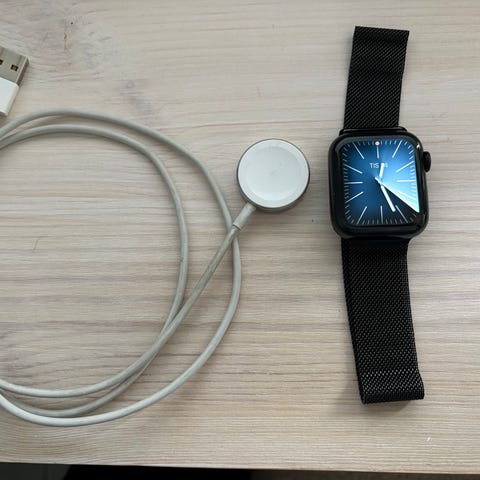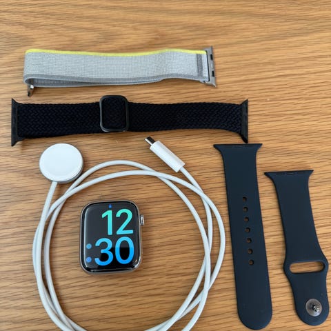 Den har 100 % batterihälsa och kommer med laddare, ett original Apple Sportloop-band samt fyra extra armband.
